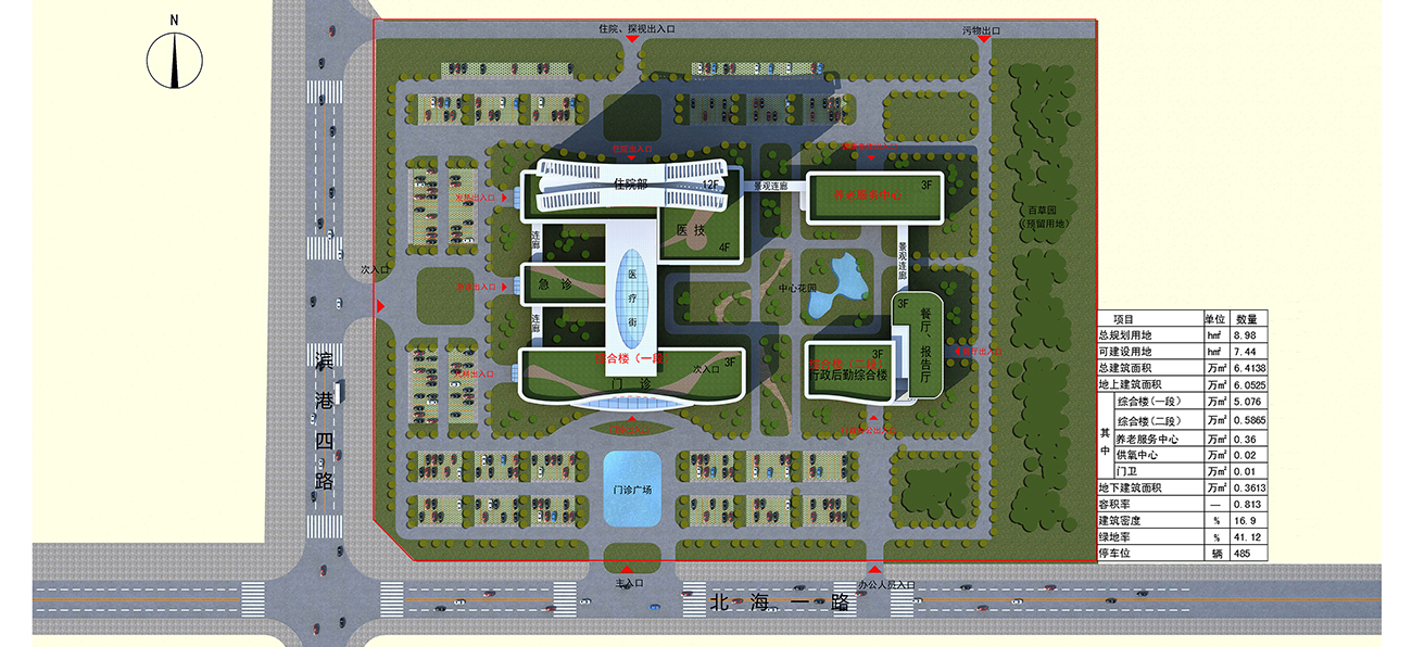 北海人民醫(yī)院設(shè)計(jì)將“以人為本,管理便捷;衛(wèi)生安全,運(yùn)行高效;節(jié)能環(huán)保,綠色生態(tài)”的概念,貫穿整個(gè)設(shè)計(jì)過程,強(qiáng)調(diào)對(duì)環(huán)境的尊重,包括院區(qū)所在的大環(huán)境及院區(qū)內(nèi)部的小環(huán)境。通過深入的調(diào)查與分析,力爭(zhēng)使整個(gè)建筑群與自然環(huán)境和景觀和諧相處,病人在這樣的環(huán)境中能夠看到綠樹、藍(lán)天,呼吸到新鮮的空氣,激發(fā)其對(duì)生命的渴望和戰(zhàn)勝病痛的意志,從而達(dá)到積極配合治療的目的,同時(shí)工作人員常年工作于此,能身心舒暢,保持較高的工作效益。