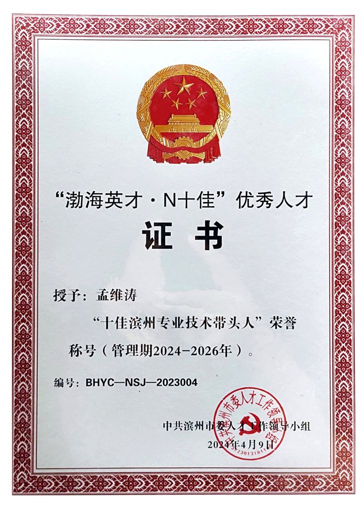 經(jīng)中共濱州市委人才工作領(lǐng)導(dǎo)小組嚴(yán)格評(píng)選,公司員工孟維濤榮獲“十佳濱州專(zhuān)業(yè)技術(shù)帶頭人”榮譽(yù)稱(chēng)號(hào)。